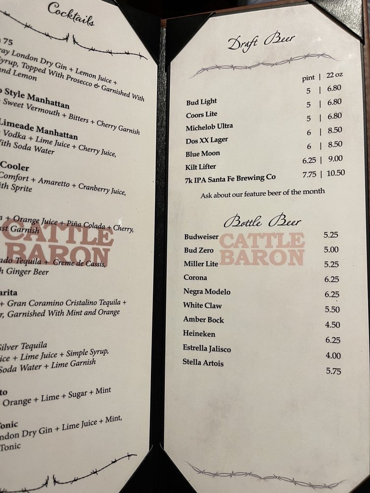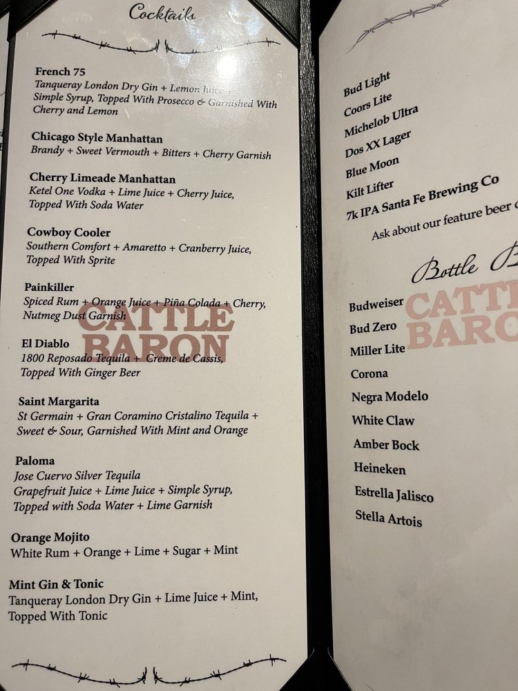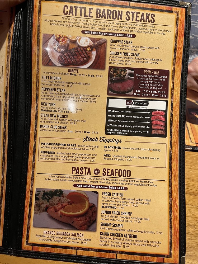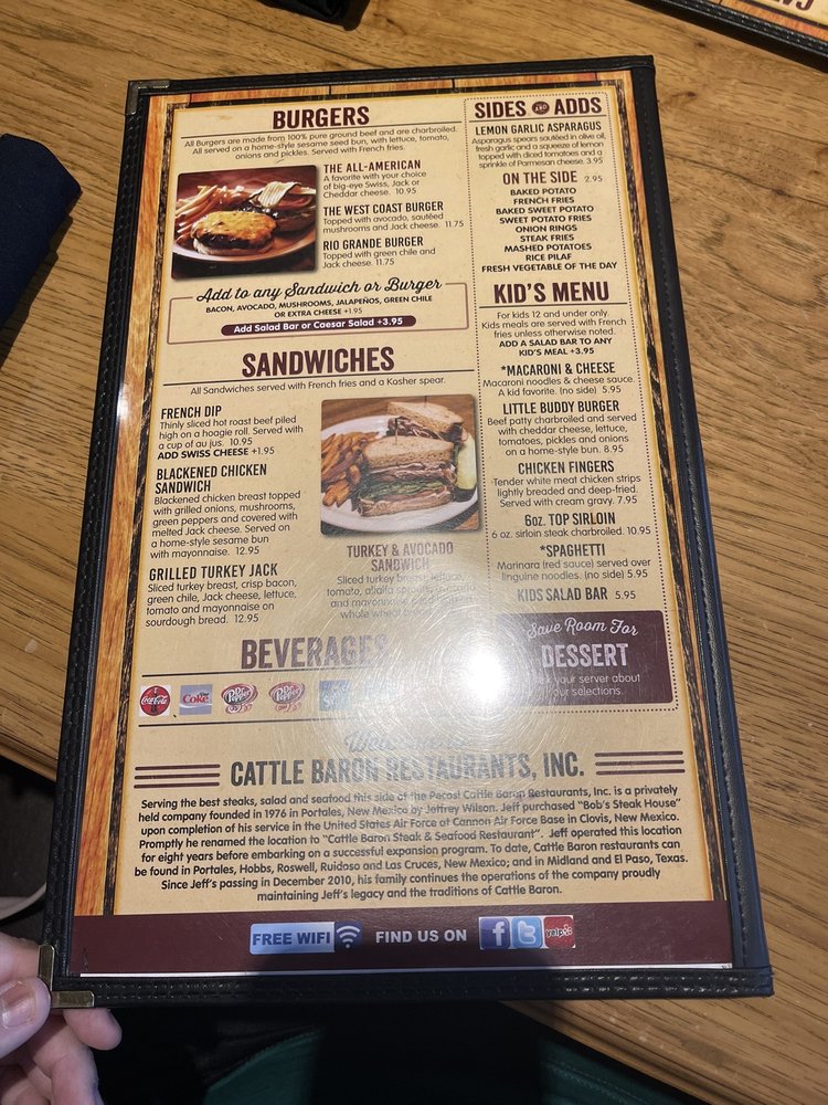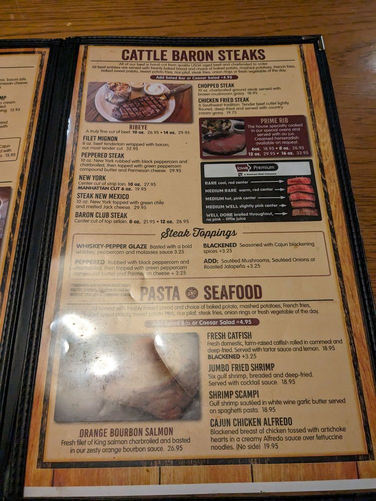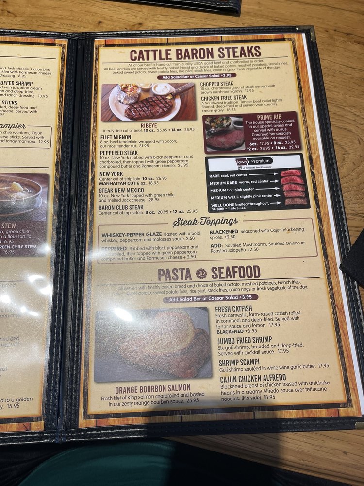 Cattle Baron, a popular steakhouse in Las Cruces, NM, offers a wide variety of American and seafood dishes. Known for its excellent service and inviting ambiance, this restaurant caters to all types of diners— from families to groups. Customers rave about the perfectly cooked steaks, delicious prime rib, and fresh salad bar. The menu also includes sampler appetizers like the green chile wontons, and savory sides like broccoli and asparagus. With attentive servers like Pammy and Mike, dining at Cattle Baron is a delightful experience. Whether you're in the mood for a hearty steak or a fresh salad, this restaurant will not disappoint. Make sure to try the sweet tea and save room for leftovers, as the portions are generous. Don't miss out on this gem of a dining destination.